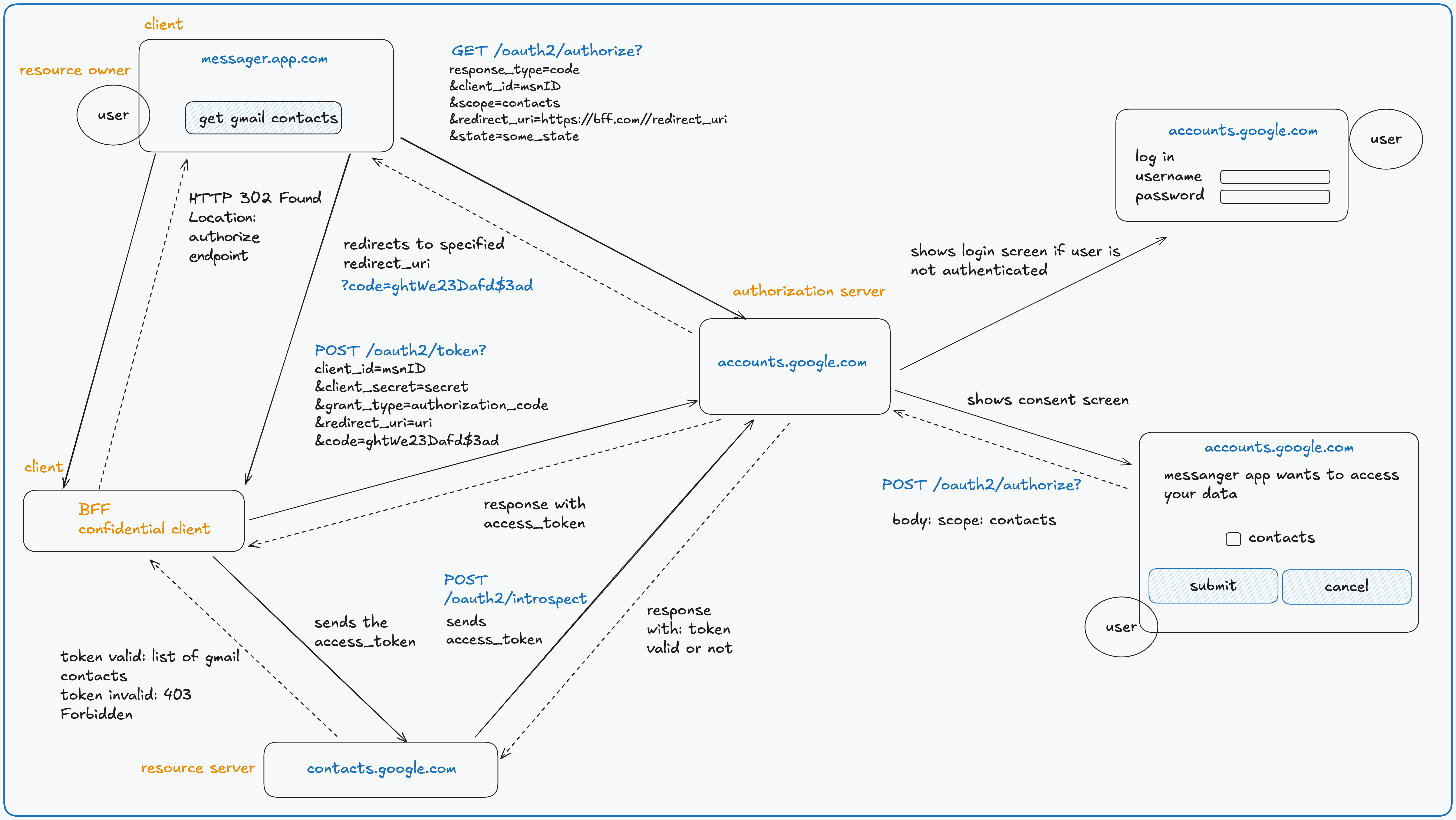 In this example we have a (messenger.app.com) that wants to access User (Resource Owner) Gmail contacts. Flow starts when User initiates Authorization Request on (messenger.app.com) by clicking “Get Gmail Contacts” button. (messenger.app.com) sends request to BFF (Confidential Client) which is responsible for communicating with Authorization Server, BFF then returns HTTP 302 response with Location response header containing URL to Authorization Server - GET /oauth2/authorize.