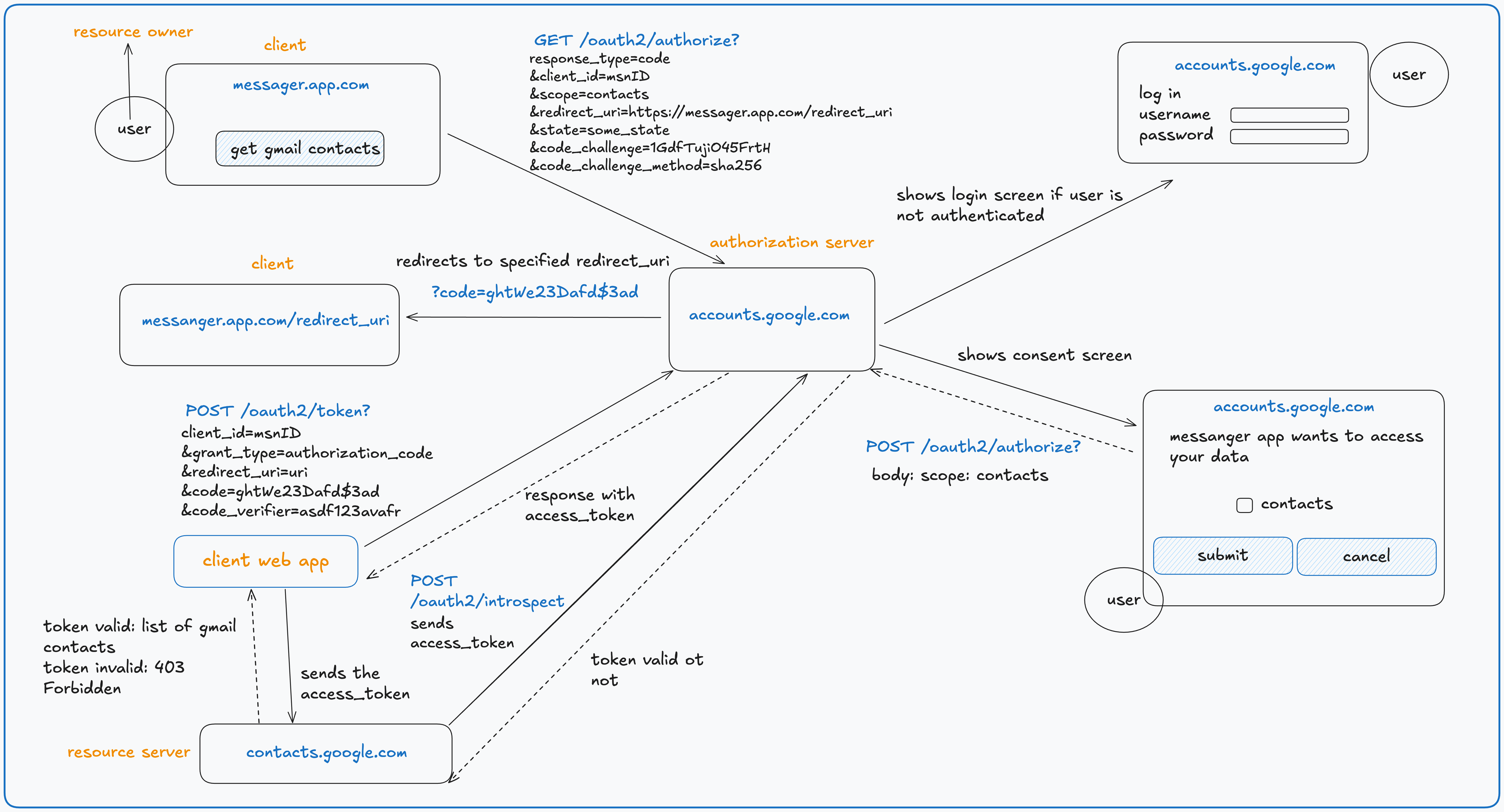 In this example we have a Public Client (messenger.app.com) that wants to access User (Resource Owner) Gmail contacts. Flow starts when User initiates Authorization Request on (messenger.app.com) by clicking “Get Gmail Contacts” button. Client app redirects User to Google’s authorization server (accounts.google.com) with GET /oauth2/authorize request. The request contains: