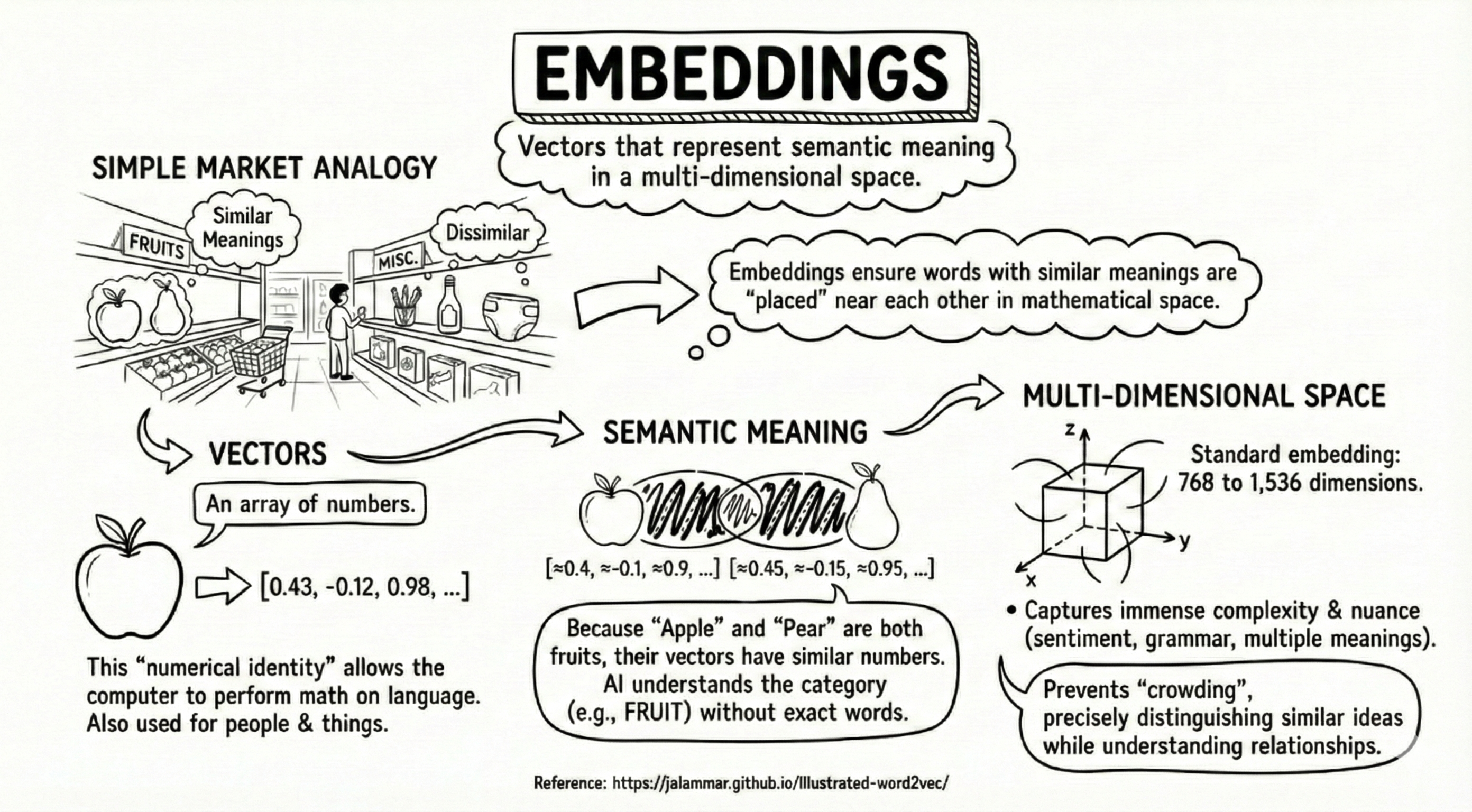 A great way to visualize this is the layout of a supermarket. Similar products are always grouped together; you won’t find pens, ketchup, and diapers on the same shelf. In the same way, embeddings ensure that words with similar meanings are “placed” near each other in the model’s mathematical space.