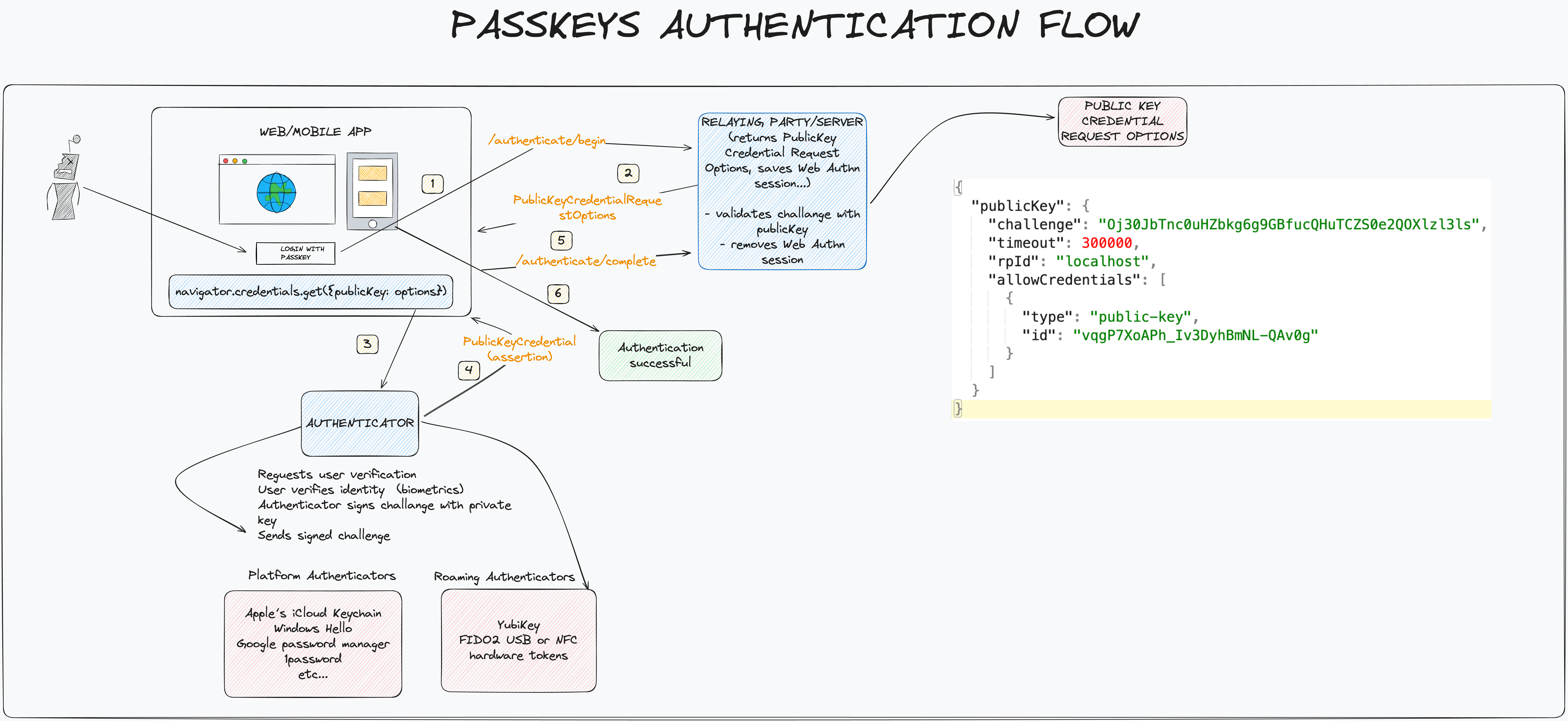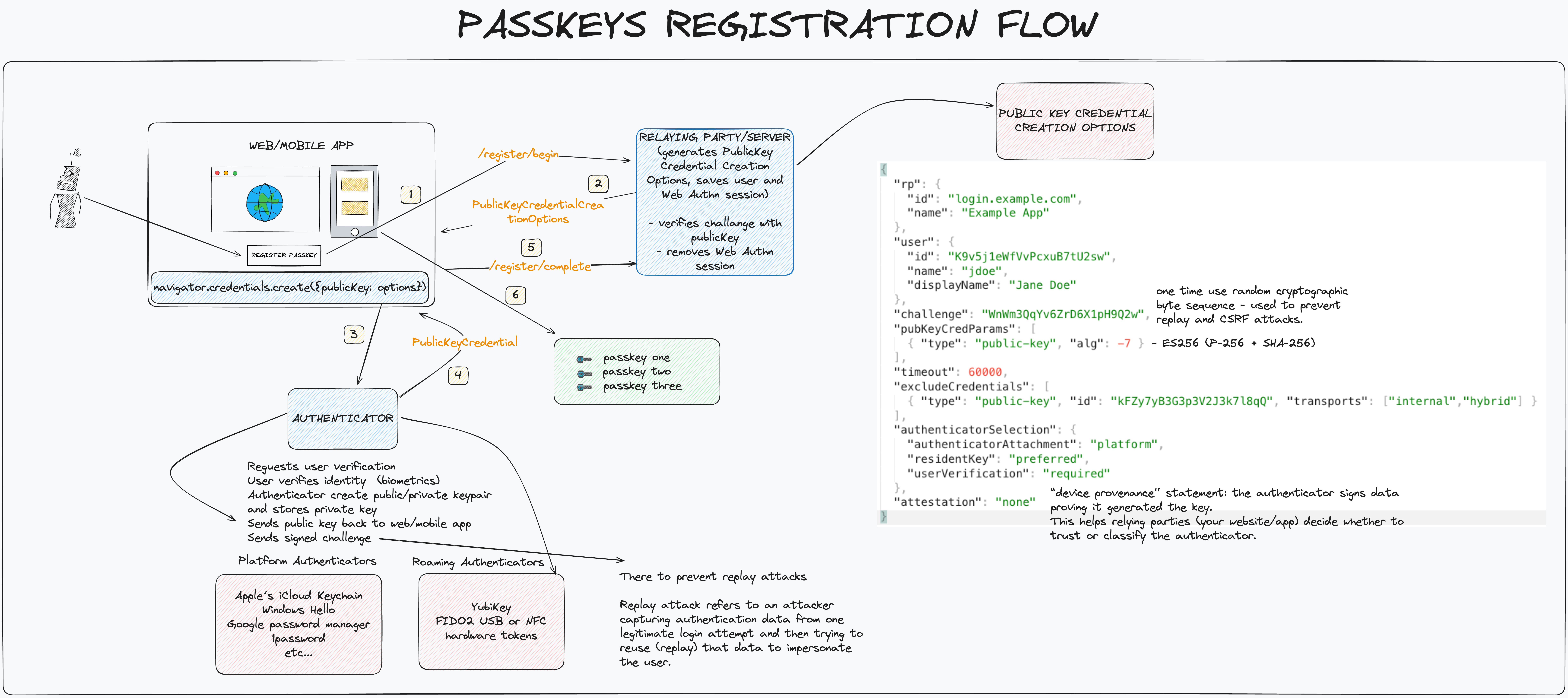 The React client calls the Gateway to start registration flow. The Gateway proxies request to the Passkeys Service, which generates registration options. The browser receives the options which include challenge (random byte sequence used to prevent replay and CSRF attacks) and prompts the user for biometrics (FaceID/TouchID). The device creates a new public/private key pair and signs the challenge using the private key. The frontend sends the new public key and the signed challenge back to the Gateway, which forwards it to the Passkeys Service. The Passkeys Service verifies the signature. If valid, it stores the public key for the user’s account, completing the registration.